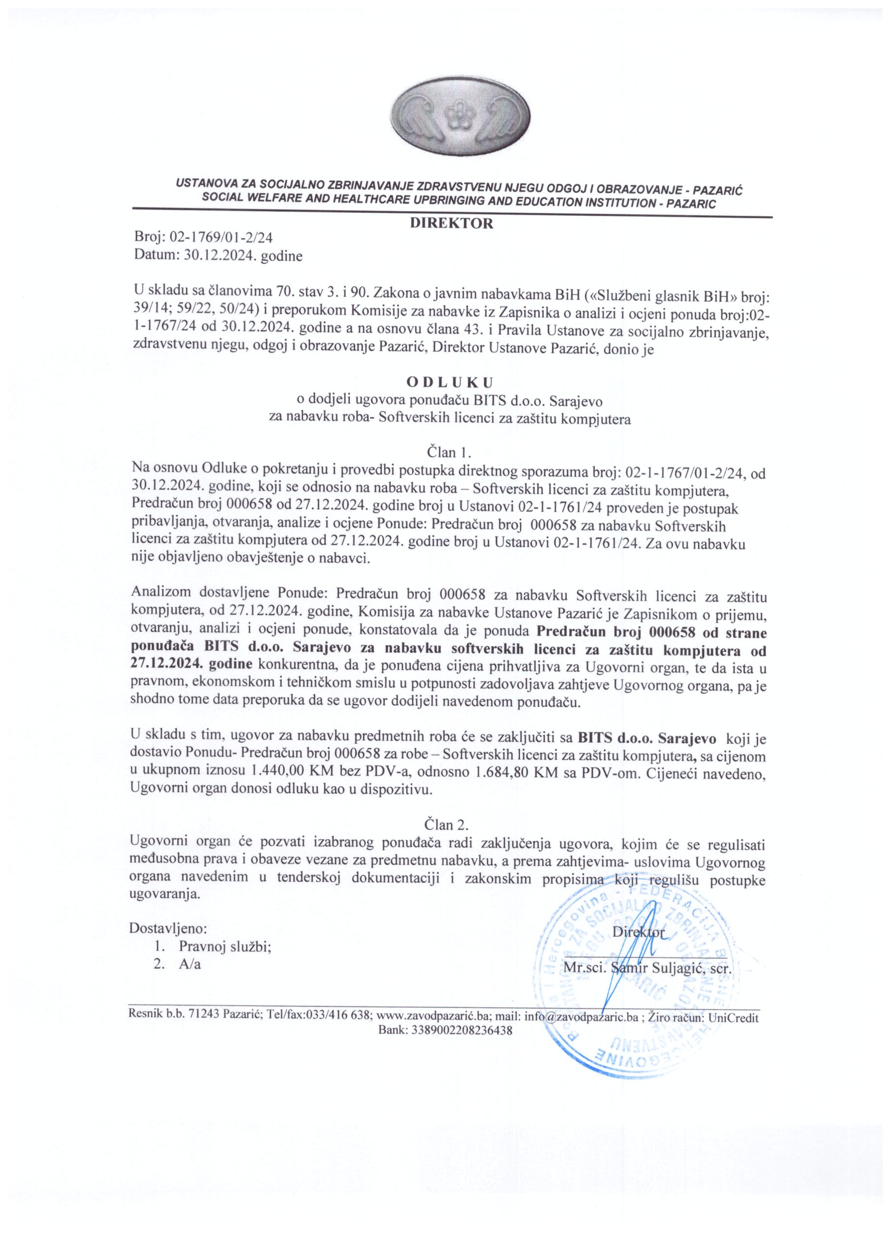 Odluka o dodjeli ugovora ponuđaču Institutu za standarde i sigurnost d.o.o Sarajevo BiH za nabavku usluge-Usluge redovnog godišnjeg audit nadzora ISO 0991:2015 PREUZMI
