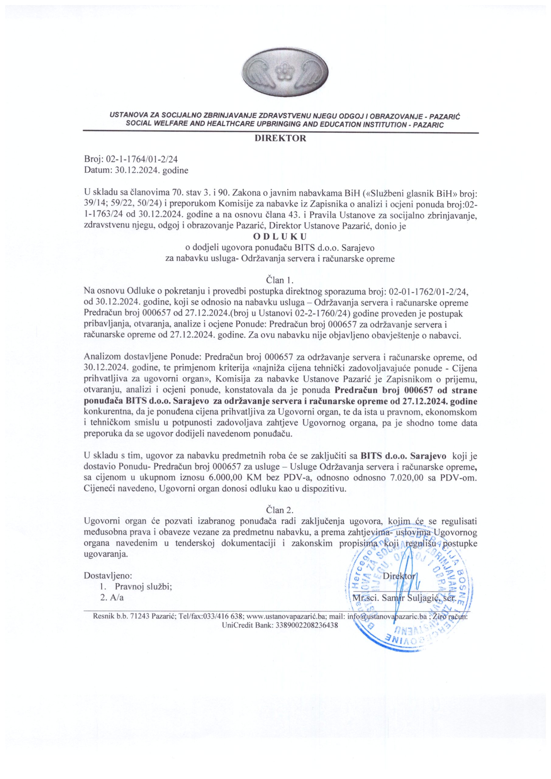 Odluka o dodjeli ugovora ponuđaču “Bits” d.o.o. Sarajevo za nabavku usluga-Održavanje servera i računarske opreme PREUZMI