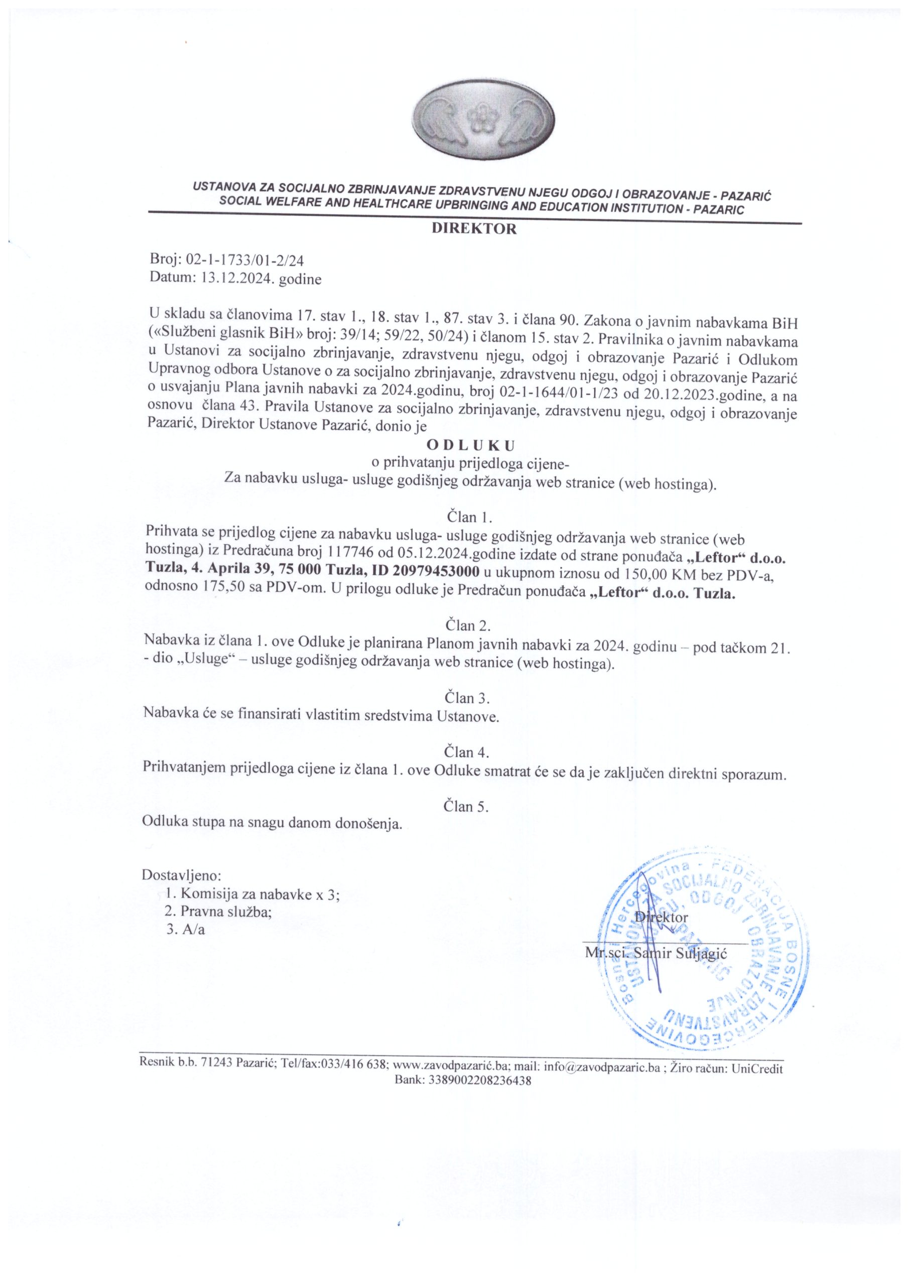 Odluka o prihvatanju cijene za nabavku usluga-usluge godišnjeg održavanja web stranice (web hostinga) PREUZMI